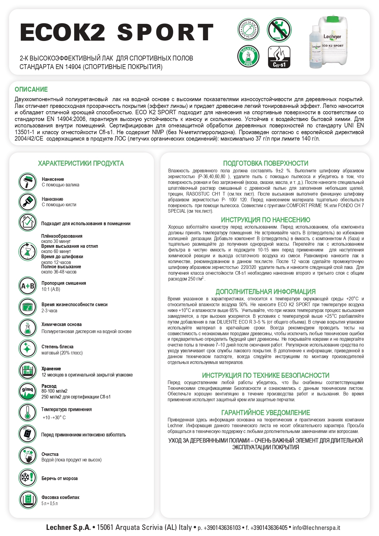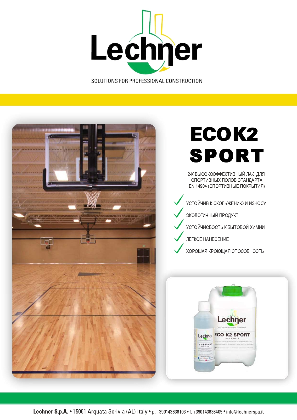 Lechner ECO K2 SPORT 2-К ЛАК ДЛЯ СПОРТИВНЫХ ПОЛОВ Двухкомпонентный полиуретановый лак на водной основе с высокими показателями износоустойчивости для деревянных покрытий. Лак отличает превосходная прозрачность покрытия (эффект линзы) и придает древесине легкий тонированный эффект.