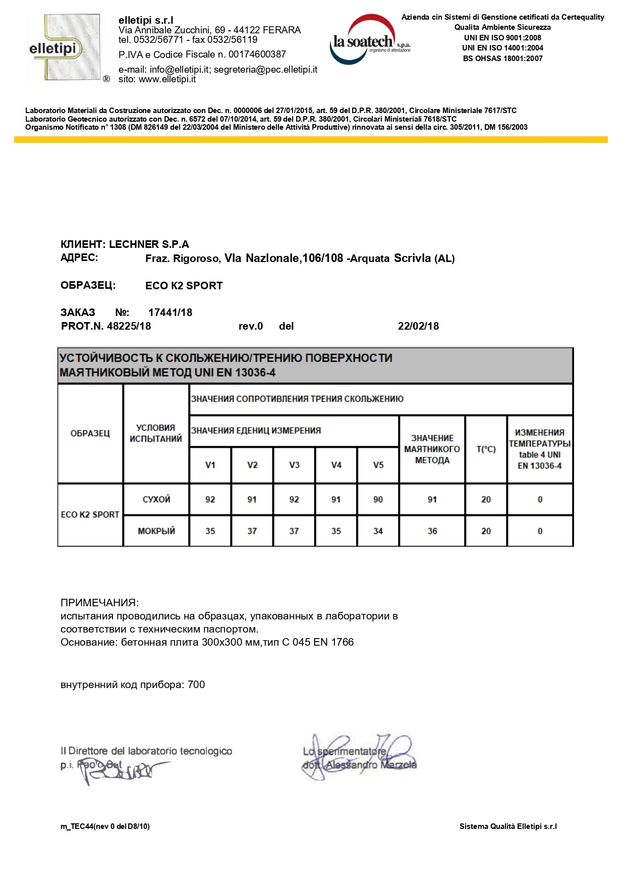 ECO K2 SPORT подходит для нанесения на спортивные поверхности в соответствии со стандартом EN 14904:2006, гарантируя высокую устойчивость к износу и скольжению. Устойчив к воздействию бытовой химии. Для использования внутри помещений. Сертифицирован для огнезащитной обработки деревянных поверхностей по стандарту UNI EN 13501-1 и классу огнестойкости Cfl-s1. Не содержит NMP (без N-метилпирролидона). Произведен согласно с европейской директивой 2004/42/CE содержащимся в продукте ЛОС (летучих органических соединений): максимально 37 г/л при лимите 140 г/л.