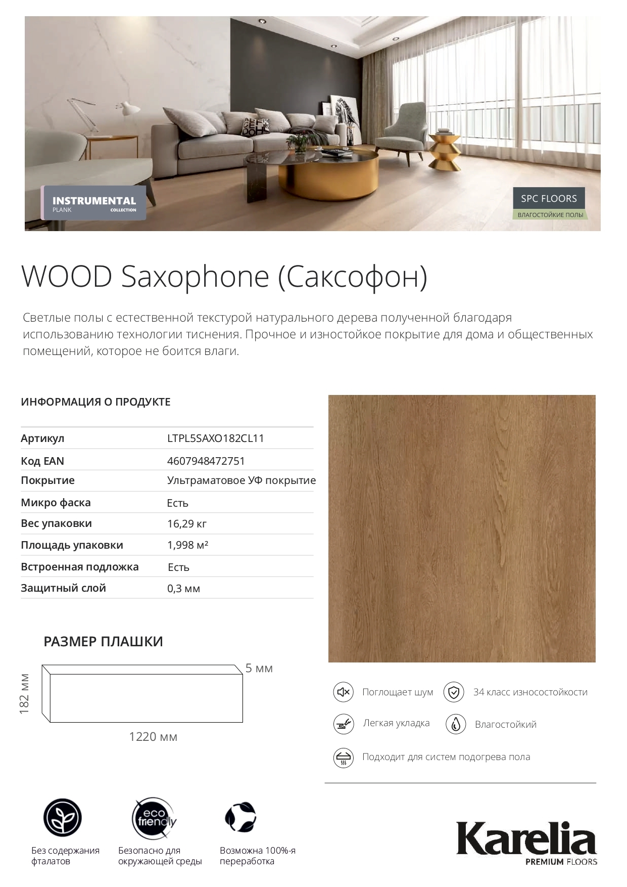 SPC плитка замковая Karelia Instrumental Саксофон 1220*182*5 мм (1.998 м2)