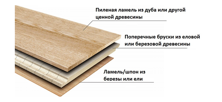Классическая паркетная доска — это трёхслойная конструкция: верхний слой из дуба/ясеня, средний слой из хвойных ламелей поперёк волокон, нижний — стабилизирующий шпон. Такой «сэндвич» даёт натуральную поверхность, приличную стабильность и предсказуемое поведение в бытовых режимах.