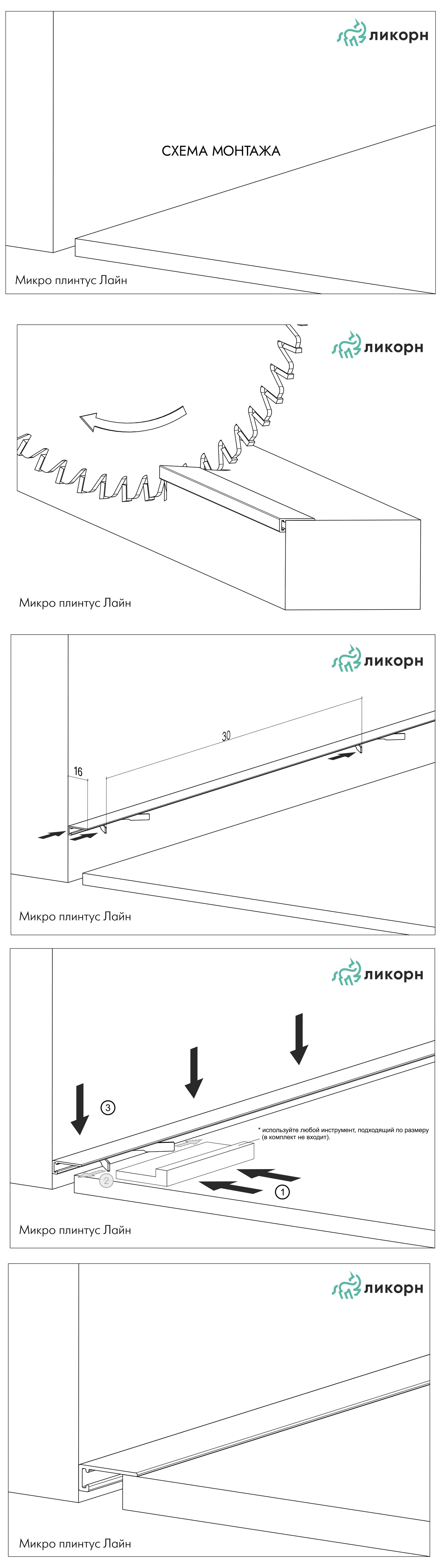 Микро плинтус Ликорн Лайн L-образный закрывает технологический шов укладки чистового пола. Упрощённая альтернатива скрытого плинтуса, но не требует подготовительных работ по монтажу. 1 шт. плинтуса поставляется в комплекте с 7 пружинами.