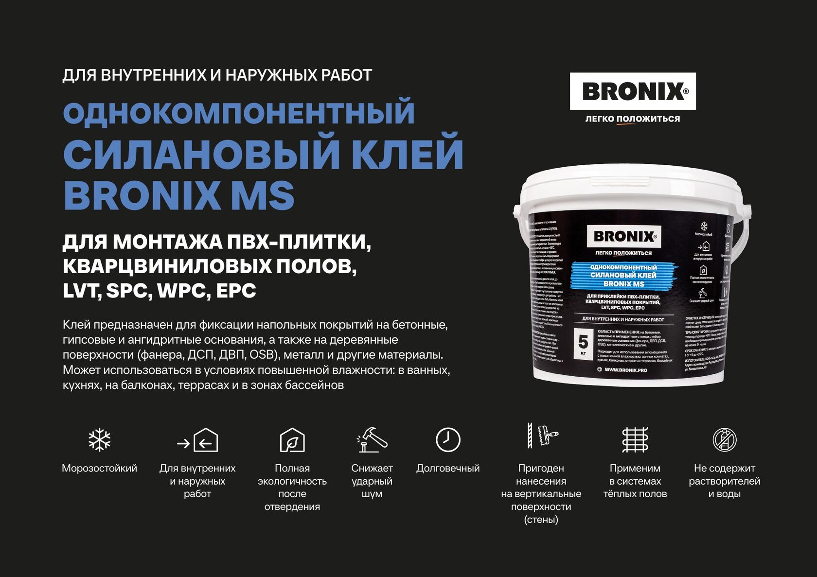 Однокомпонентный силановый клей Bronix MS (5кг) - цена 5800.00 руб. за шт. Чтобы купить в интернет-магазине клей BRONIX, оформите заказ на сайте Parketbrothers.ru или свяжитесь с нами любым удобным способом, наши менеджеры с радостью помогут вам и ответят на все интересующие вопросы.