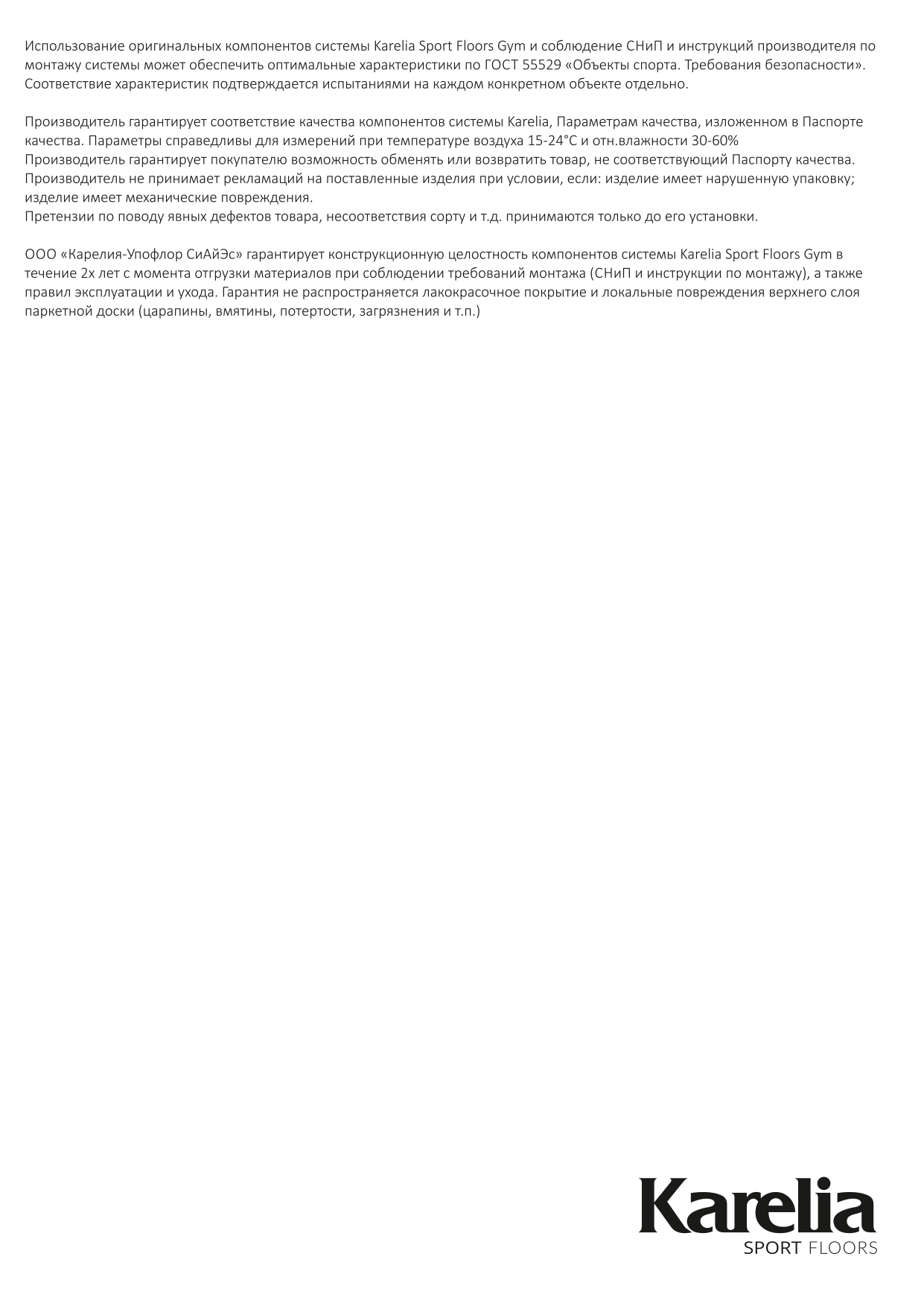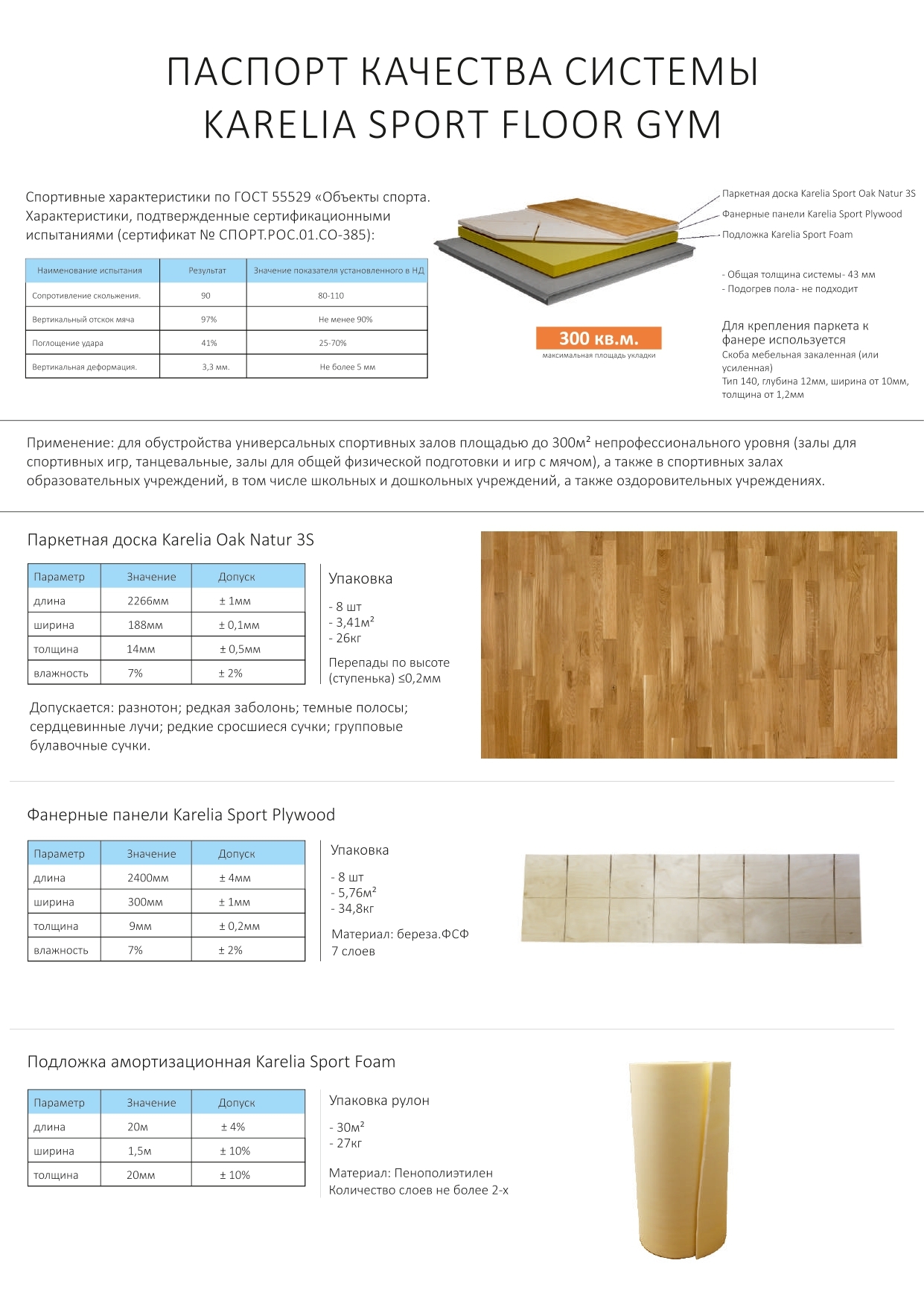 В комплект входит 1)30111781A0500111Karelia Sport Natur 3S (паркетная доска) 2226х188х14 мм, 3,41 м2 в уп. 2)K8100522Karelia Plywood Sport (Фанерные панели) 2400x300x9 мм, 5,76 м2 в уп. 3)K811024Karelia Foam Sport (Подложка амортизационная) 1500x20000x20 мм, 30 м2 в уп. 4)K8100552Karelia Sport Skirting (плинтус спортивный) 2400 х 65 х 18 мм, 12 п.м. в уп.