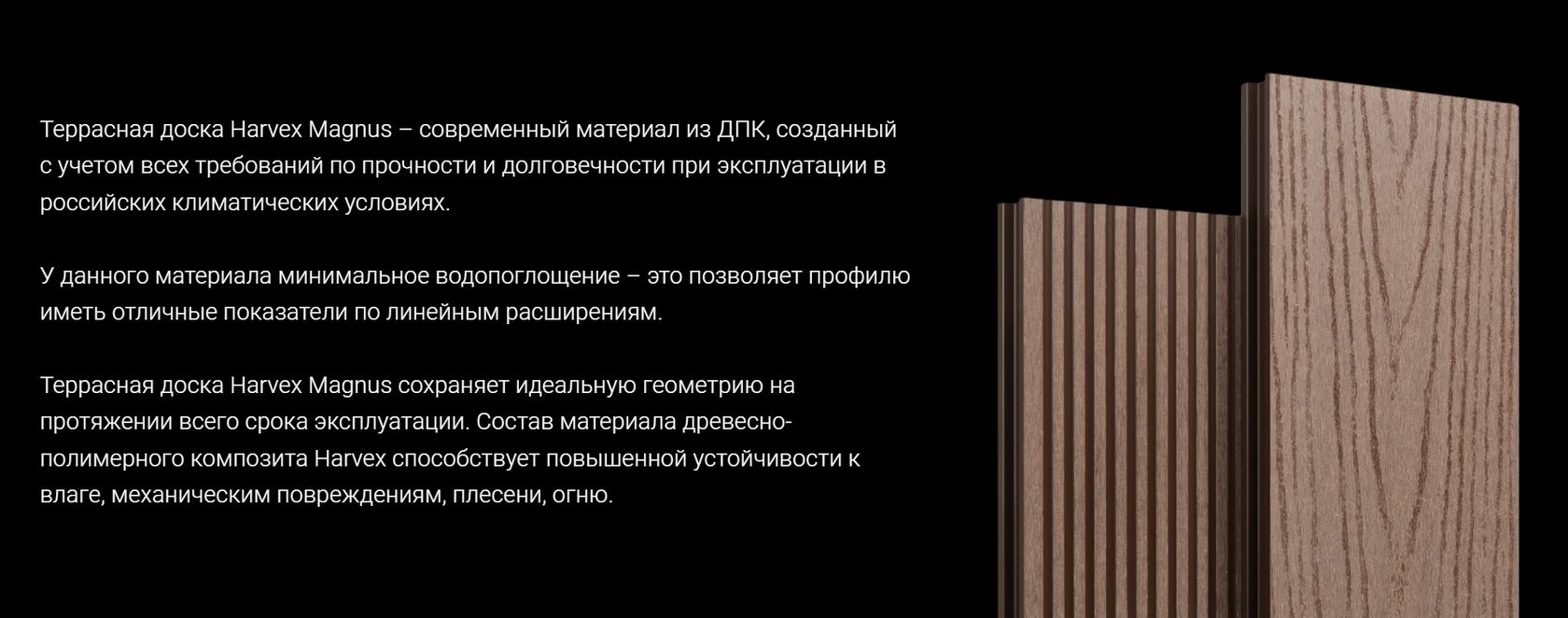 Террасная доска Harvex Magnus – современный материал из ДПК, созданный с учетом всех требований по прочности и долговечности при эксплуатации в российских климатических условиях. У данного материала минимальное водопоглощение – это позволяет профилю иметь отличные показатели по линейным расширениям. Террасная доска Harvex Magnus сохраняет идеальную геометрию на протяжении всего срока эксплуатации. У доски две рабочие поверхности: текстура дерева и вельвет. Профиль поставляется в шести самых популярных и практичных расцветках – венге, шоколад, антрацит, натур, терракот и слоновая кость. В комплектацию доски Harvex Magnus входят оригинальные кляймера из нержавеющего металла, уголок, ступени,монтажная лага и универсальная планка из ДПК. Состав материала древесно-полимерного композита Harvex способствует повышенной устойчивости к влаге, механическим повреждениям, плесени, огню.